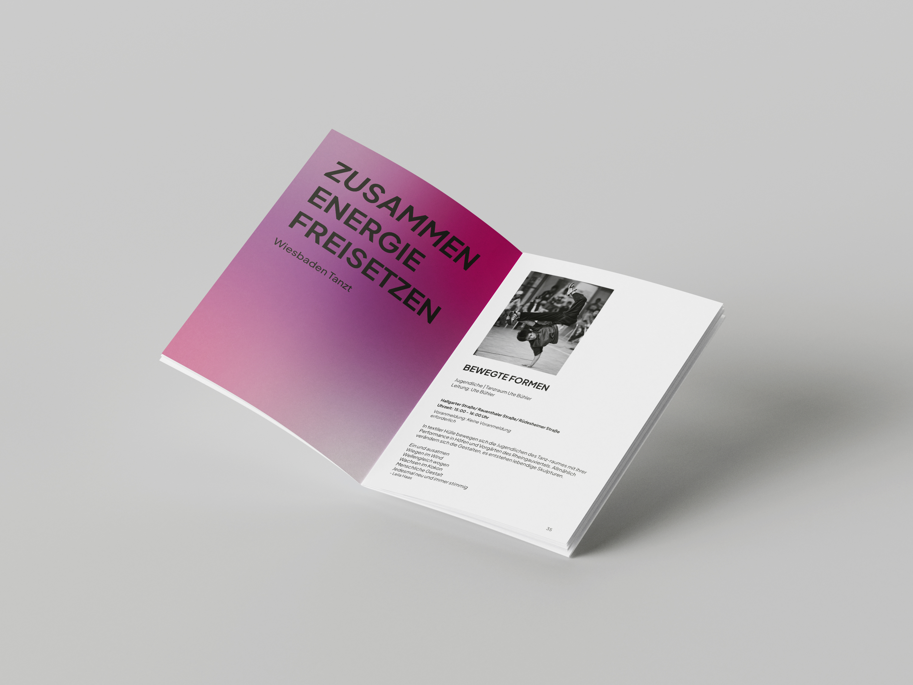 Visual identity redesign and campaign for the dance festival Wiesbaden Tanzt. The redesign translates the festival theme into a dynamic visual language that emphasises movement, energy and togetherness. A vibrant colour system and expressive graphics form the core of the identity and campaign, creating cohesion across posters, programme booklet and further print and digital applications.